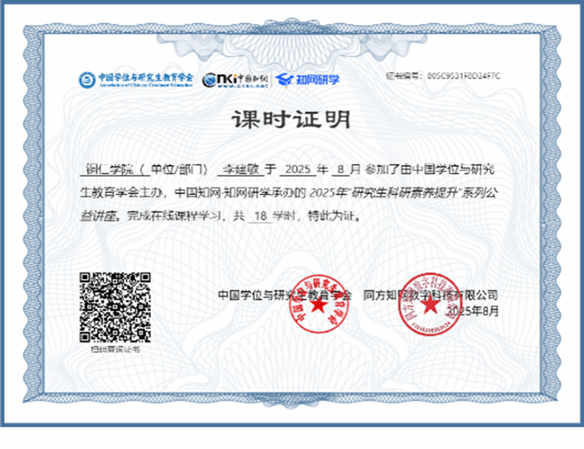 本次讲座为期三天,内容体系完整、结构层次清晰。8月27日上午,讲座正式开课,同学们在线聆听了中国学位与研究生教育学会秘书处的开场致辞,进一步明确了学习目标与重要意义。随后,全体研究生围绕六大核心模块系统展开学习。在“科研思维培养”模块中,通过中国工程院院士赵中伟、复旦大学葛剑雄教授的精彩分享,同学们深入理解了创新性思维的培养路径,体悟了科学与人文之间的内在联系,为研究生阶段的学术探索奠定了坚实的思想基础;在“科研工具使用”模块中,南京大学宋玉梅、知网研学高梓婷、四川师范大学周建芳等专家深入讲解了学术资源的高效利用方法及AI工具的应用技巧,帮助同学们掌握基于可信AI提升学术效率的路径,为科研选题与论文写作提供了有力的技术支撑;在“学术问题凝练”模块中,北京大学程乐松、哈尔滨工业大学张昊春教授指导同学们强化问题意识,掌握研究分析方法,学会从海量文献中提炼核心研究内容,提升科研起点;在“文献阅读与写作”模块中,北京理工大学黄厚兵、上海交通大学杨枫教授分享了科研创意生成与高水平论文发表的实践经验,尤其针对人文社科类论文写作提供了具有指导性的建议,助力同学们迈好科研生涯的第一步; 在“学术规范与积极成长”模块中,中国农业大学赵勇、中国科学院大学肖斌教授聚焦学术伦理与心理调适,引导同学们树立科研诚信意识,顺利完成从“学习者”向“研究者”的心理与能力转变;在“研究生涯规划”模块中,东华大学丁明利、天津大学在读博士刘剑、华中农业大学刘胜军、西安电子科技大学党启伟等嘉宾,通过“四维地图”理论、文献操作实操、竞赛经验分享及科技服务社会等典型案例,为同学们明晰了未来发展的路径,助力全面提升综合素养。8月29日下午,随着结课仪式的顺利举行,我院研究生在充实的学习过程中圆满完成全部课程任务。