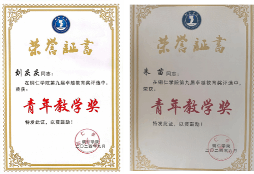 2024年9月,刘庆庆、朱苗老师在美加墨世界杯官方网站第九届卓越教育奖评选中获“青年教学奖”。
