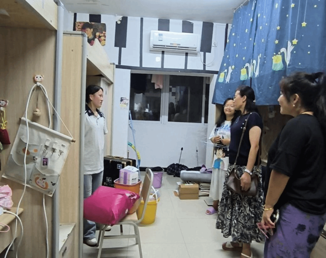 走访队伍在清雅苑门口集结。院领导首先向各宿管工作人员详细了解新生入住情况,并叮嘱切实做好安全巡查与后勤保障。随后,院领导及辅导员们分楼层,逐层逐间走进宿舍,与新生亲切交谈。“家是哪里的?”“气候还习惯吗?”“对专业了解多少?”一句句贴心问候迅速拉近了师生距离。