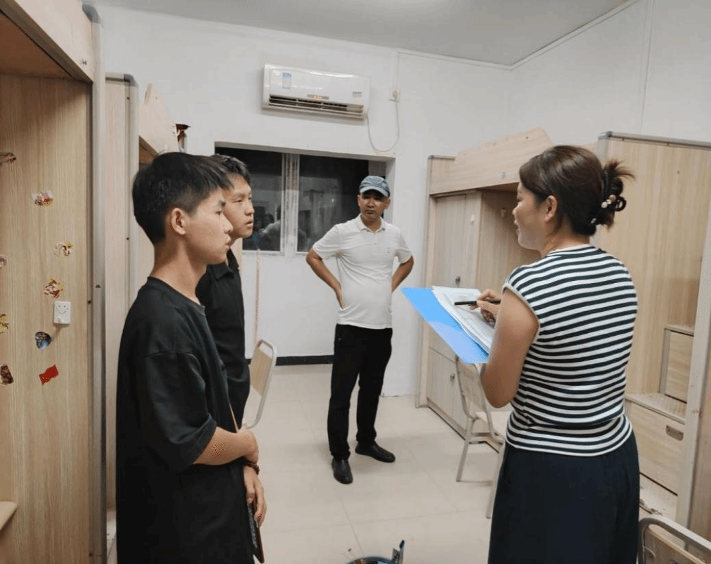 走访过程中,院领导及新生辅导员就防诈骗、宿舍用电安全、心理健康等话题进行温馨提示;辅导员老师们现场叮嘱新生加入班群,确保学生诉求“第一时间响应、第一时间解决”。