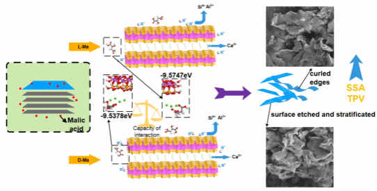 该研究聚焦低分子有机酸对映体在矿物-界面过程中的手性效应,围绕苹果酸的两种立体异构体—左旋体(L-苹果酸)和右旋体(D-苹果酸)—对蒙脱石溶解与重金属行为的影响开展系统研究。研究团队首先通过实验手段揭示两种对映体在蒙脱石溶解过程中对元素活化的差异,阐明手性选择性在非生物界面反应中对有机酸-矿物相互作用的调控作用。进一步结合分子动力学模拟与密度泛函理论计算,从分子结构与电子层面解析不同立体异构体与黏土矿物作用机制的差异,为理解“有机酸—黏土矿物—重金属”耦合体系提供了更精细的理论支撑。