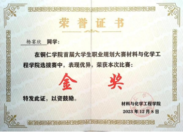 2023年12月1日,2022级制药工程专业学生杨宴欣在首在美加墨世界杯官方网站首届大学生职业规划大赛材料与化学工程学院选拔赛中,获“金奖”,入围校赛。