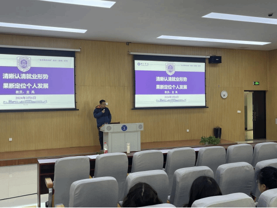 接着,龙禹老师以“清晰认清就业形势,果断定位个人发展”为主题,通过详实的数据,系统地分析了今年各专业领域的就业状况、行业需求及发展趋势,并为毕业生们指明高质量就业渠道,最后为毕业生同学们提出“心怀感恩,终不负你”的人生忠告。