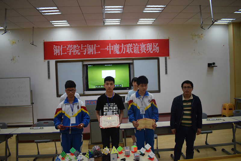 本次联谊赛分为二阶速拧、三阶速拧、异形速拧赛,团体赛。三阶魔方比拼,分为五轮比赛,两人一组,二阶魔方比赛,分为三轮,两人一组,异形比赛,四人一组,团体赛,社团各自派五人参赛,赛前,主持人介绍魔方的由来,阅读比赛规则,紧接着,由铜仁一中曳舞社学生带来的舞蹈为本次联谊赛拉开序幕。比赛过程中,双方选手各自展现出自己的技巧,认真灵活的玩弄魔方,并以最快的速度完成比赛,经过每轮的淘汰赛,参赛者更是信心倍增,沉着应对,细看魔方,速度越来越快,各不相让,赛中,为缓解紧张的比赛气氛,设制游戏抽奖活动,并由赞助商大自然纯牛肉火锅城提供的魔方挑战来结束比赛,赛后,分别出现二阶冠军1名,亚军1名,季军1名;三阶冠军1名,亚军1名,季军1名;异形一等奖1名,二等奖1名,三等奖1名,团体赛双方共赢。最后,由铜仁一中老师吴宇灵,材料与化学工程学院老师罗海荣分别给获奖者颁发荣誉证书,联谊赛在热烈的掌声中圆满结束。