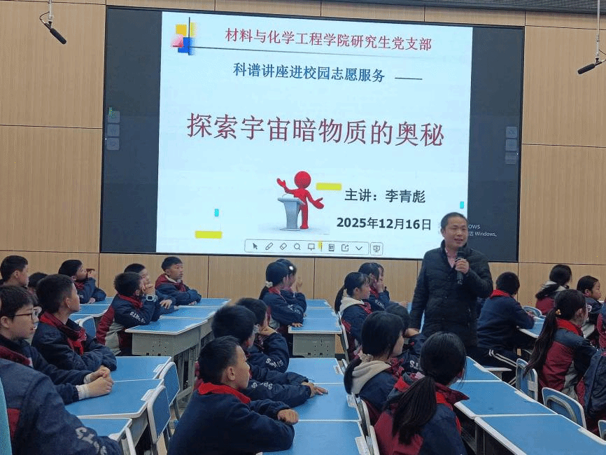 与此同时,在录播室,六年级的同学们则跟随研究生党支部书记李青彪同志进行了一场深邃的《探索宇宙暗物质的奥秘》之旅。从看得见摸得着的物质,到神秘莫测的暗物质与暗能量,李青彪同志用生动的比喻和形象具体的天文发现故事,展现了宇宙的浩瀚与人类对世界认识的局限性。同学们被星系旋转、宇宙加速膨胀等奇妙现象深深吸引,眼神中充满了对星空的好奇与向往,课后仍围着李青彪同志追问关于宇宙的种种问题。
