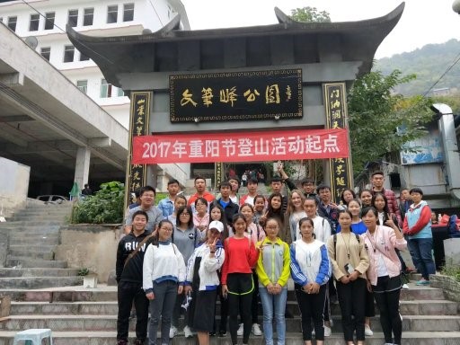 首先,到达文笔峰山脚,由工作人员宣读登山的注意事项,在登山途中注意安全,发现自己或者同伴有不舒服的情况,请马上与领队报告。随后各位同学开始登山,登山途中,大家互帮互助,一边观看沿途秋景,一边向来自柬埔寨和俄罗斯的三位留学生重阳节的来历和意义,进行文化的交流。一路上,大家谈意甚浓,欢声笑语此起彼伏。历经一个多小时的攀登,到达山顶。在山顶的篮球场,同学们积极和爬山的老人聊天进行互动,一起打羽毛球进行健身运动,艺术专业的同学为他们表演歌舞,同学们用自己的方式让的老人们脸上露出幸福的笑容。最后拍照留念。