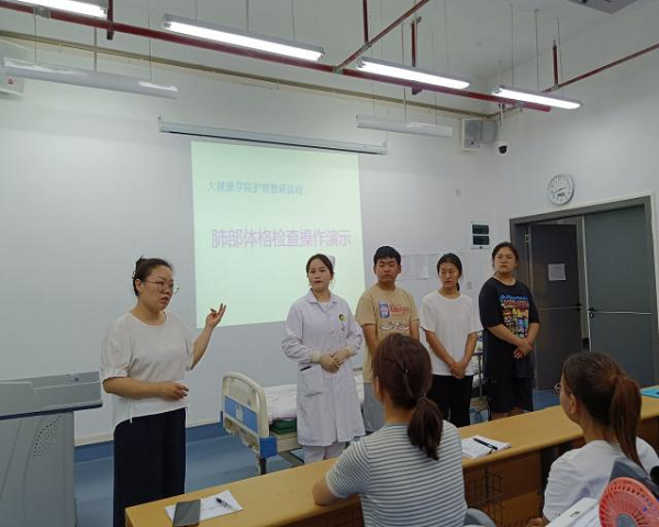 为了更好地提升学生的临床护理技能水平,增长其技能比赛的竞赛经验,大健康学院护理教研室邀请曾在广州中山大学附属第三医院岭南医院实习并在该院护理技能大赛获奖的19级护理毕业班学生于5月29日下午六点,在实训楼四楼阶梯教室开展“肺部体格检查操作演示”。本次操作演示者为参赛获得一等奖的吴迪同学及其队友杨兰兰、唐艳玲、陈城等,“病人”由19级的陈泽望同学扮演。出席此次教研活动的有护理教研室的印双红、田芬、易彩霞、王睿智、孙馨、李寅翠、刘娴等老师,以及护理健康系2021级、2020级、2019级的全体同学。