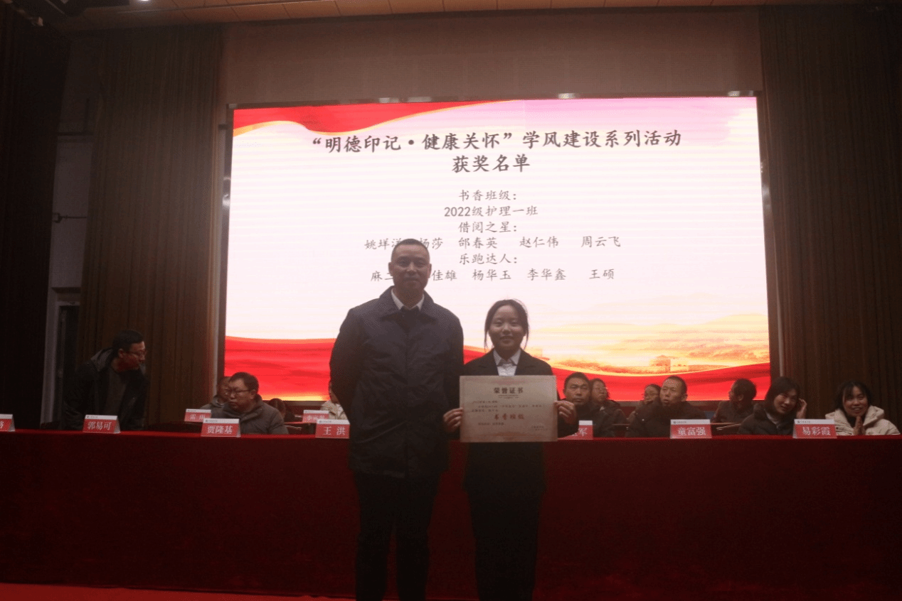 2024年12月16日晚7点,大健康学院召开2024年度“明德印记·健康关怀”系列活动表彰大会。出席本次表彰大会的有大健康学院党委书记、院长余静、党委副书记王洪、副院长徐路、大健康学院各科室负责人以及各班班主任、辅导员等,表彰大会由副院长徐路主持。会上党委副书记王洪宣读“明德印记,健康关怀”系列活动表彰文件以及通报大健康学院学生2024年国家级奖项、省级奖项获奖情况。接着由参会领导和老师分别为获奖学生颁发了“明德印记,健康关怀”系列活动荣誉证书,颁发奖项包括三书比赛、排球比赛、迎新篮球赛、微团课比赛、护理技能大赛、学风建设系列活动、足球比赛、大健康学院第五届田径运动会等奖项。
