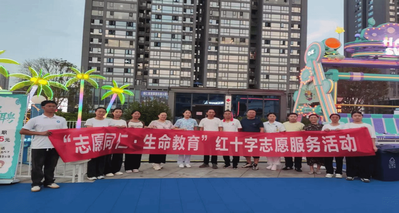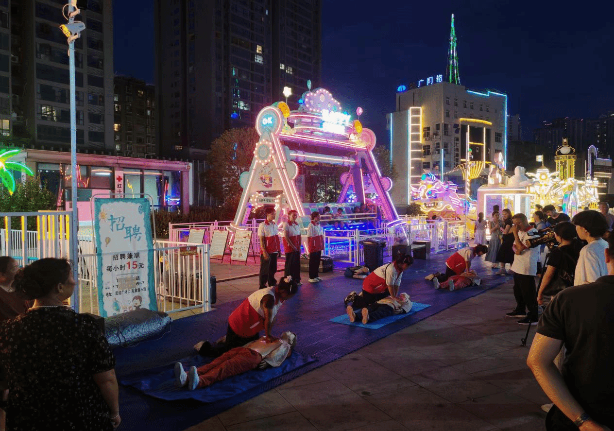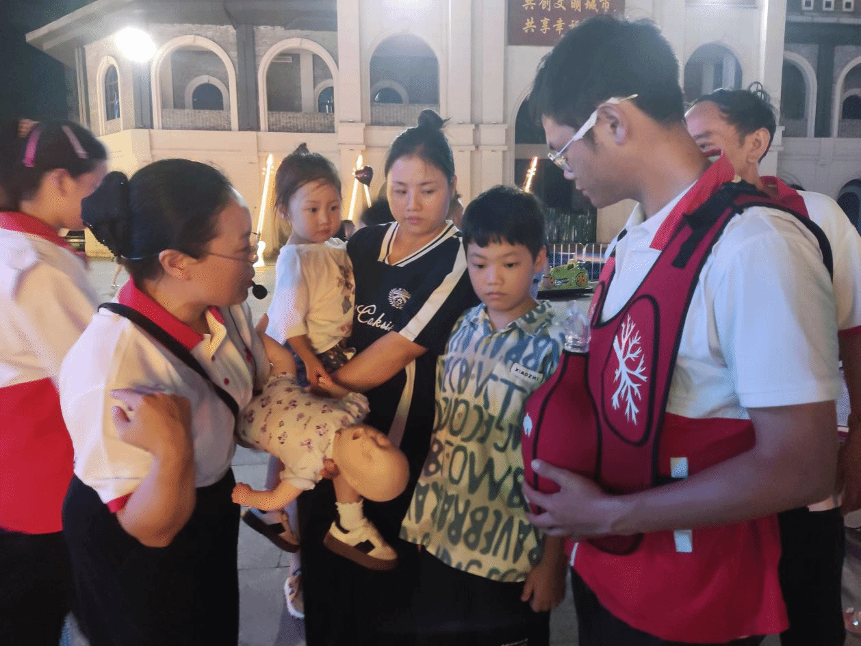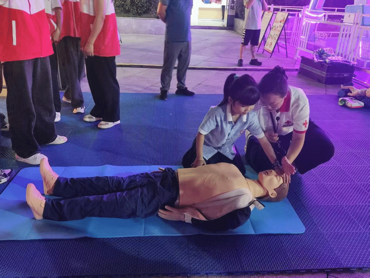 8月29日晚,美加墨世界杯官方网站大健康学院田芬老师带领美加墨世界杯官方网站应急救护社6名2023级护理专业学生,应邀参加由铜仁市红十字会联合碧江区红十字会、铜仁职业技术大学及三江文化旅游发展有限公司在中南门志愿服务站举办的“志愿同仁,生命教育”红十字志愿服务活动。活动聚焦应急救护技能普及,通过专题培训、现场演示、互动实践等形式,系统讲解心肺复苏(CPR)、自动体外除颤仪(AED)使用及海姆立克急救法,吸引了众多市民参与。