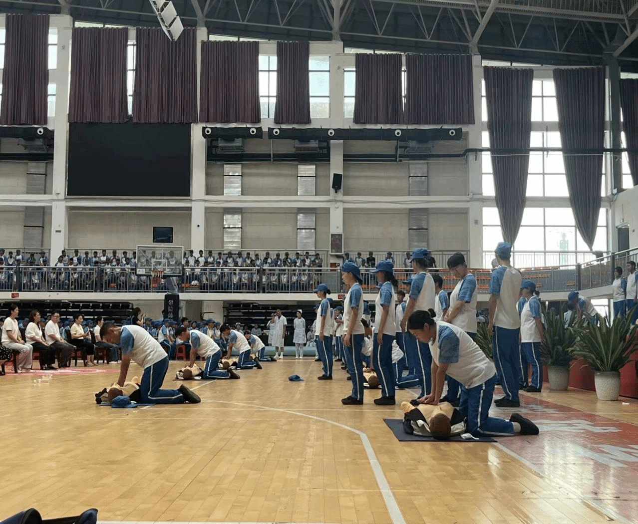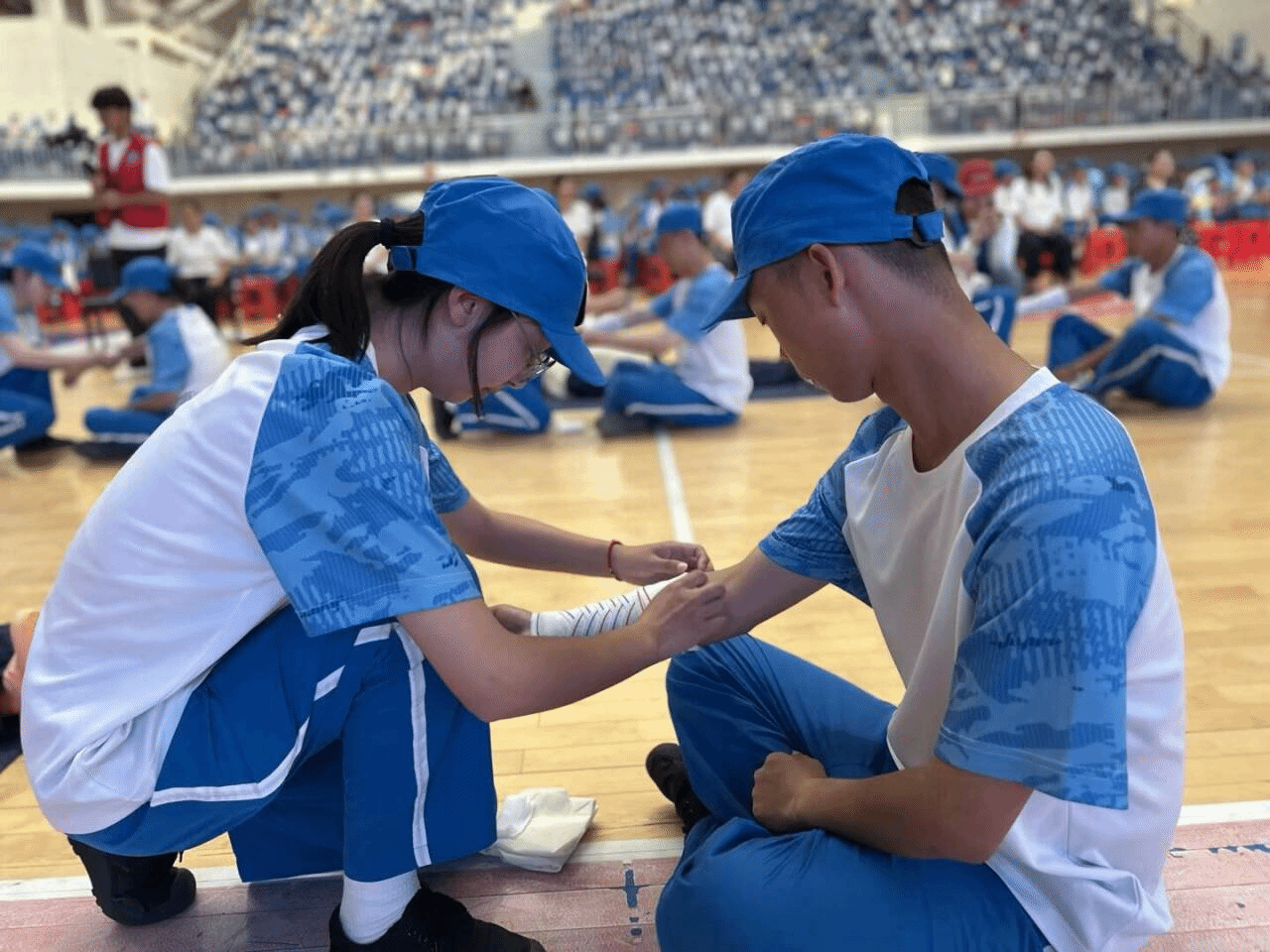 为增强2025级新生安全防范意识与自救互救能力,2025年9月16日至17日,美加墨世界杯官方网站应急救护社全体成员(护理专业学生)在大健康学院护理老师的指导下,分别在足球场和体育馆圆满完成了2200余名新生军训应急救护培训任务及技能展示。