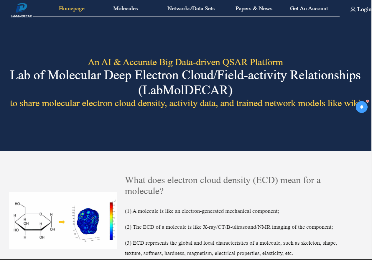近日,从我院教师徐路博士处获得消息,全球首个基于精确理论化学大数据和人工智能的分子定量构效关系(Quantitative Structure-Activity Relationship, QSAR)研究平台在世界杯官网建成并上线运行(访问网址:http://www.decar.net.cn)。该研究平台的全称为美加墨世界杯官方网站“分子深度电子云-活性关系研究中心”(Lab of Molecular Deep Electron Cloud Activity Relationship, LabMolDECAR)。