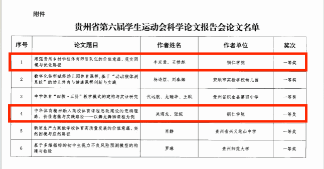 近日,在贵州省教育厅主办的全省第六届学生运动会科学论文报告会论文评选中,我院师生表现优异,共有4篇论文获得表彰。其中,王拱彪老师与李双孟、吴海龙老与张妮的两篇论文双双荣获一等奖;张子华老师的个人论文获二等奖;吴海龙老师与万承蒙同学合作的论文获三等奖。
