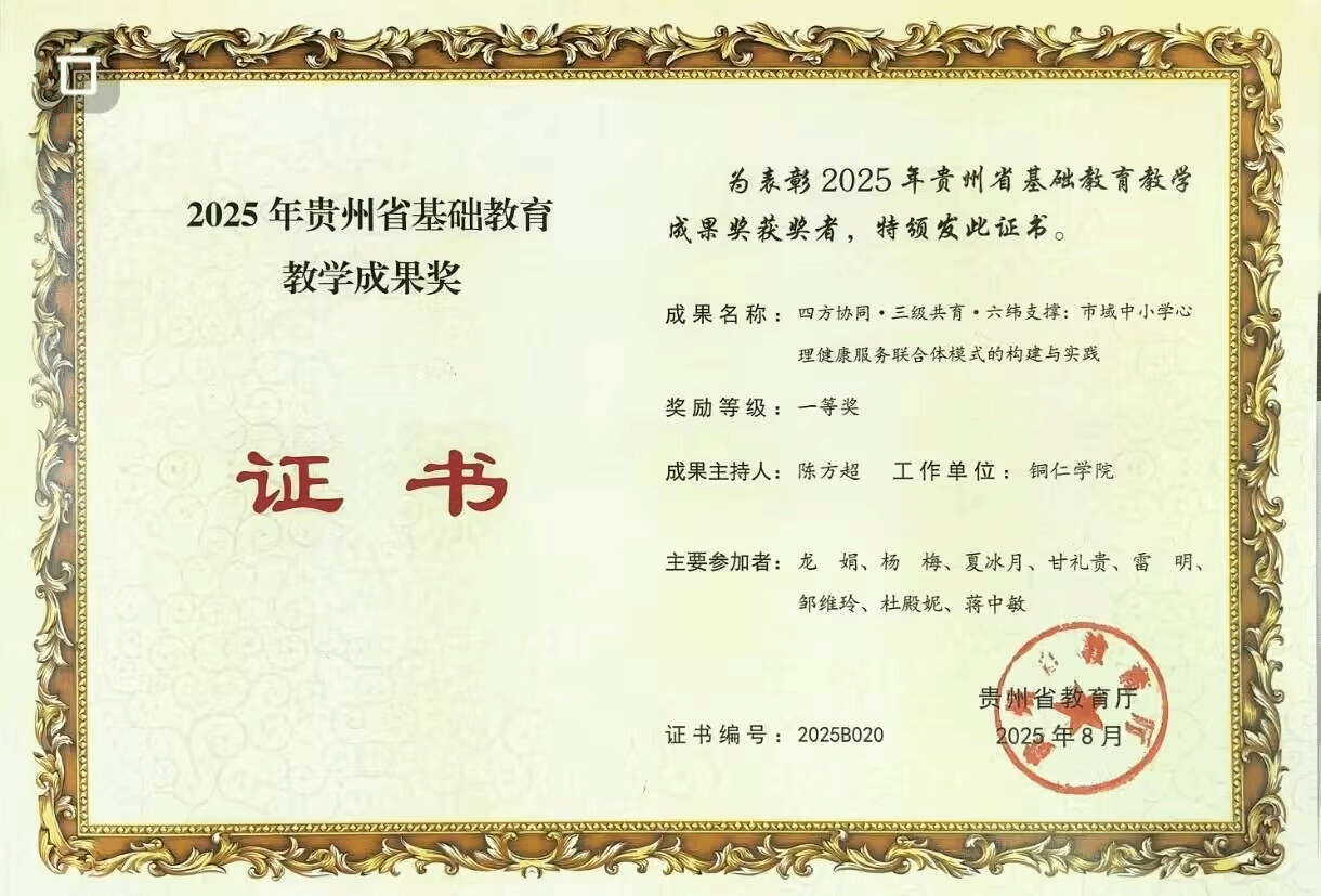 近日,在贵州省教育厅组织评选的2025年贵州省基础教育教学成果奖申报工作中,我院教师陈方超博士携手基础教育教师团队,一举斩获省级一等奖。陈方超博士作为心理学领域的专家,凭借其深厚的理论功底和丰富的实践经验,把先进的心理学相关理念运用到基础教育实践,是高校引领地方基础教育发展的有力写照,更是高校与基础教育领域深度合作的成功典范。