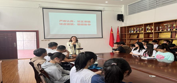 培训会上,田老师给同学们分配好各自的任务后,围绕径赛规则的三大板块给大家进行了讲解,强调大家需要明白自己裁判岗位的任务,需要和组内人员分工合作,才可以取得成功;雷老师给大家讲解了田赛裁判规则,雷老师强调田径运动竞赛规则是开展田径竞赛工作的准则,是田径裁判员执法的依据,同学们在裁判工作中要做到严肃认真,公正准确,谦虚谨慎,团结协作,尽心尽力的完成裁判工作。
