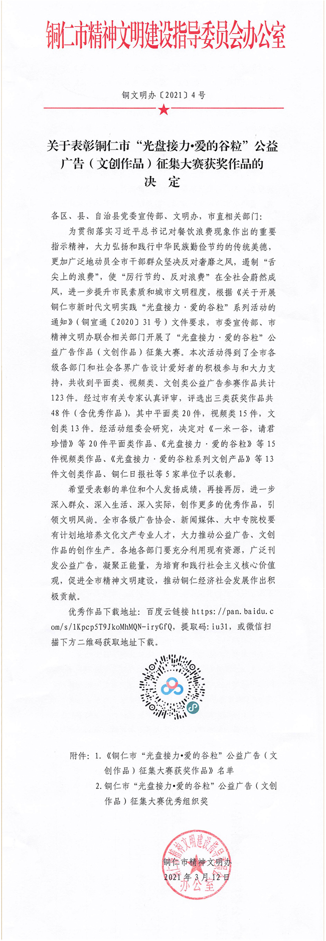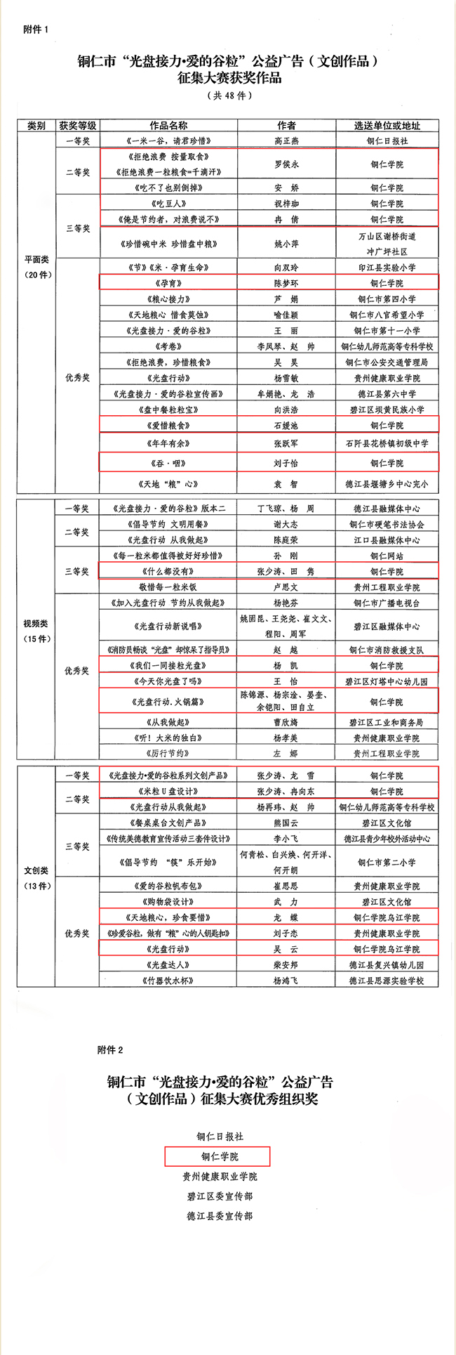 近日,由铜仁市委宣传部主办的“光盘接力·爱的谷粒”公益广告大赛公布获奖名单,共48件作品和5个单位获奖。其中,世界杯官网14件作品在文创类、平面类、视频类均有获奖;世界杯官网还荣获“优秀组织单位”。
