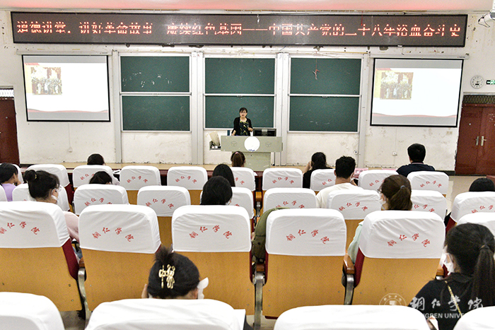 讲座伊始,刘坤新指出讲好革命故事有助于厚植广大青年大学生热爱中国共产党、热爱祖国、热爱社会主义的情感,更有助于红色基因代代传承。随后,她从开天辟地大事变与中国革命新道路、浴血抗日十四年、为新中国而奋斗三个方面展示,用一个个鲜活的“红色故事”向同学们讲述了中国共产党在新民主主义革命时期二十八年的艰苦奋斗、顽强拼搏的浴血奋斗史。最后,她总结到,为了践行初心使命,中国共产党进行了前赴后继的不懈奋斗,做出了巨大的牺牲。近现代中国的历史表明,没有任何一支政治力量能像中国共产党这样,为了民族复兴、人民幸福,不惜流血牺牲,不懈努力奋斗,团结凝聚亿万群众不断走向胜利。因此,没有共产党就没有新中国,没有共产党就没有中国特色社会主义。