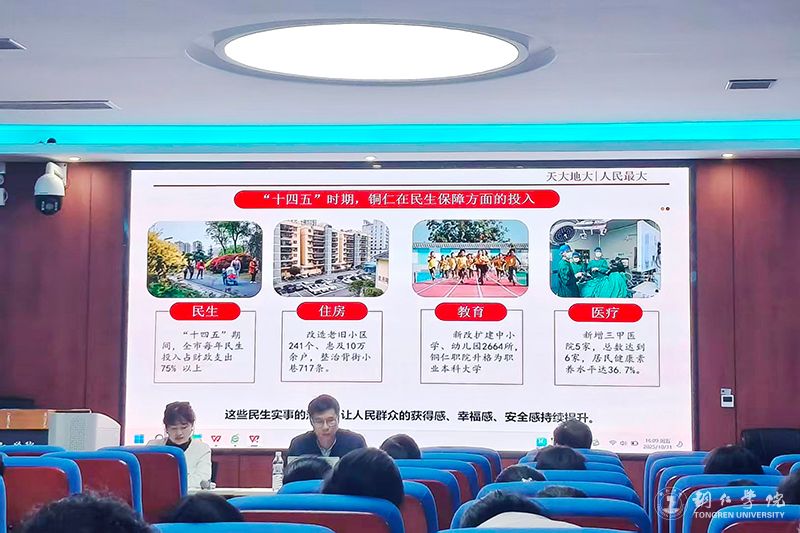 宣讲中,张佳佳与张熙钰两位老师配合默契、相得益彰,以“理论阐释+实践解读”的模式展开宣讲。宣讲伊始,张佳佳老师十四五时期的铜仁的成就切入,结合党的二十大报告中“增进民生福祉,提高人民生活品质”的战略部署,系统解读了提高人民生活品质的主体力量、内驱动力与实践路径,强调高质量发展是保障民生的根本支撑,唯有立足发展实际、回应群众需求,才能让发展成果更多更公平惠及全体人民。张熙钰老师全程默契配合,补充案例细节、梳理优化逻辑两位宣讲人一主一辅的讲解,生动诠释了“尽力而为”的责任担当与“量力而行”的科学态度他们通过讲解身边看得见、摸得着的发展变化,让在场师生深刻感受到党的创新理论在实践中的强大生命力也让大家明白,家事国事天下事,让人民过上幸福生活是头等大事。