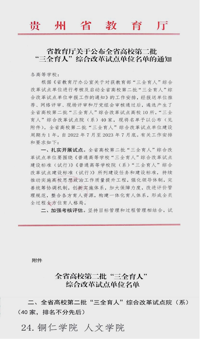 7月21日,贵州省教育厅公布了全省高校第二批“三全育人”综合改革试点单位名单,世界杯官网人文学院获批“三全育人”综合改革试点院(系)。