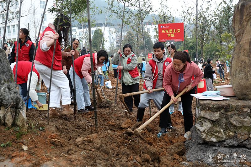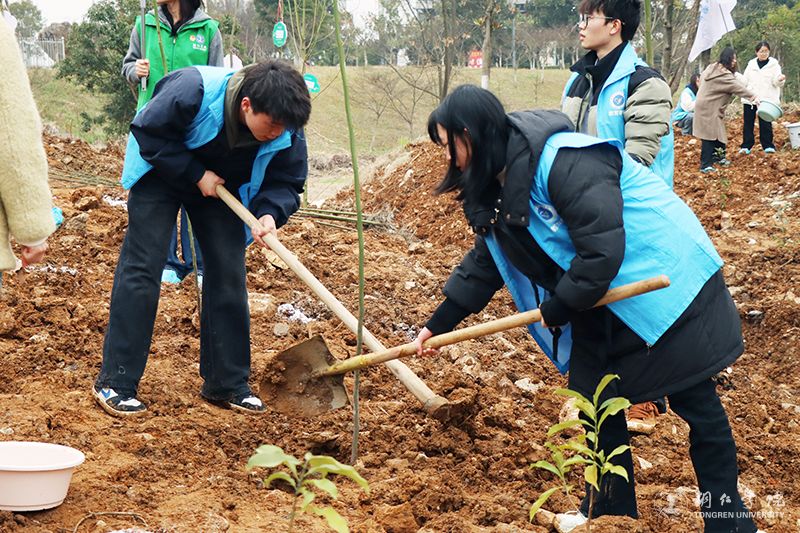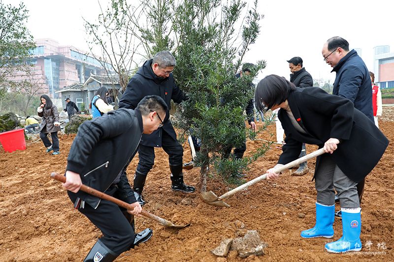 在举行简短的启动仪式后,植树活动正式开始。各学院师生按照划定区域,分工协作,相互配合。挥锄挖坑、扶苗填坑、培实新土、浇水定根……大家热情高涨,干劲十足,将一棵棵小树苗稳稳地种植在铜院的土地里。此次活动,大家积极投身植树护绿行动当中,用劳动诠释着对铜院的热爱,在活动中享受自然的春意。