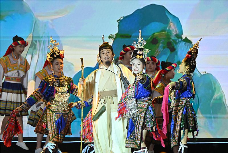 世界杯官网艺术学院陈炟妍、李佳莉老师带领2023级、2024级音乐学专业的48名同学参与了《江山行旅》《诗酒黔风》《赤水长歌》三个节目的演出。其中,田淼还扮演《江山行旅》中的徐霞客,以行吟姿态演绎《黔游日记》;48名同学们共诵共唱《七律·长征》,合诵和多声部合唱以复调织体昭示革命精神的时代传承。