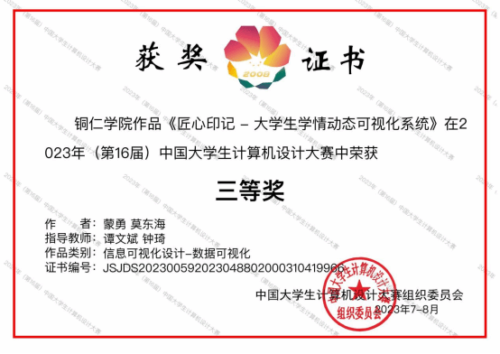 近日,(第16届)中国大学生计算机设计大赛国赛决赛正式结束。本次大赛是在院校领导的高度重视下,在教务处等职能部门的全力支持和帮助下,由谭文斌老师带队,我院学子获4项国家级奖项(国家级二等奖1项,国家级三等奖3项)。其中由周倩、谭文斌老师指导的花小飞、蒲嫦娥两名同学的作品《行路难》获微课与教学辅助组国家级二等奖;由谭文斌、易萌老师指导的旷丞吉、陆滔、吴光圣三名同学的作品《安途卫士》获人工智能应用实践组国家级三等奖;由谭文斌、钟琦老师指导的蒙勇、莫东海两名同学的作品《匠心印记 - 大学生学情动态可视化系统》获信息可视化组国家级三等奖,由邹华、饶正婵老师指导的冉光照、舒清瑜、刘亭穗三名同学的作品《生长密码 - 基于天麻生长监测与分析的可视化系统》获信息可视化组国家级三等奖。