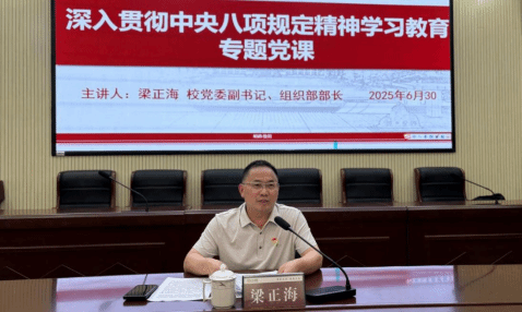 6月30日下午,党委副书记、组织部部长梁正海在艺术学院美术楼会议室讲授深入贯彻中央八项规定精神学习教育专题党课。大数据学院教工党支部、文传学院教工党支部、艺术学院教工党支部全体党员参加党课。