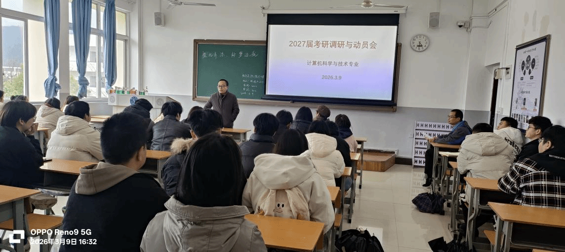 计算机科学与技术专业于2026年3月9日下午在明理楼A204教室,组织召开了2027届学生考研调研与动员会。会议由专业负责人陈花卫老师主持,大数据学院副院长黄贻望、班主任饶正婵老师及全体2027届学生共同参会。