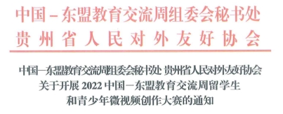 4月7日,从贵州省教育厅获悉,2022中国-东盟教育交流周留学生和青少年微视频创作大赛已正式启动,从即日起至2022年5月20日截止,面向东盟及“一带一路”沿线国家年龄在12-35岁的青少年、来华留学生、中文学习爱好者,以及中国在东盟及“一带一路”沿线国家的留学生征集参赛视频。