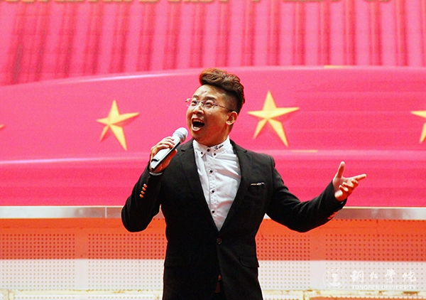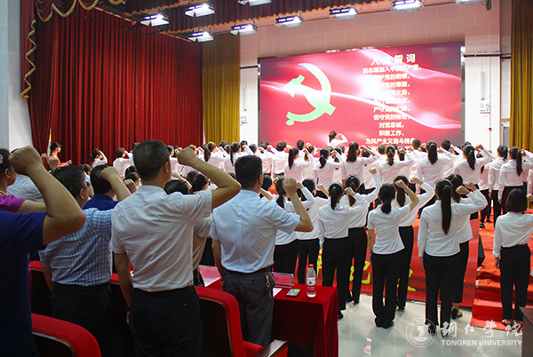党员教师代表覃春江倾情演唱了《最美的歌儿唱给妈妈听》,艺术学院合唱团以一首《我宣誓》表达了对党无比崇敬的心情。在铿锵的誓言中,全体预备党员进行了入党宣誓,正式党员重温了入党誓词。