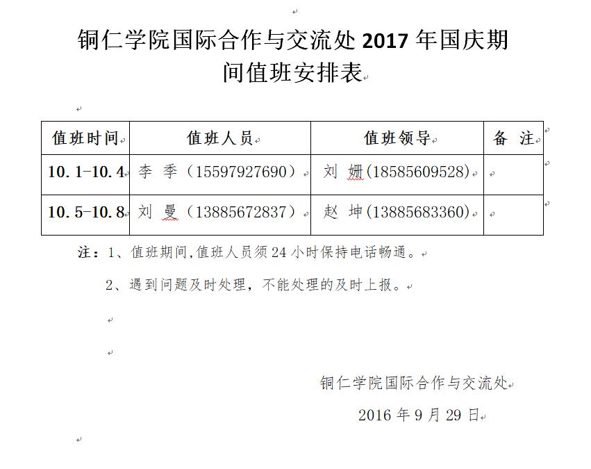美加墨世界杯官方网站国际合作与交流处2017年国庆期间值班安排表