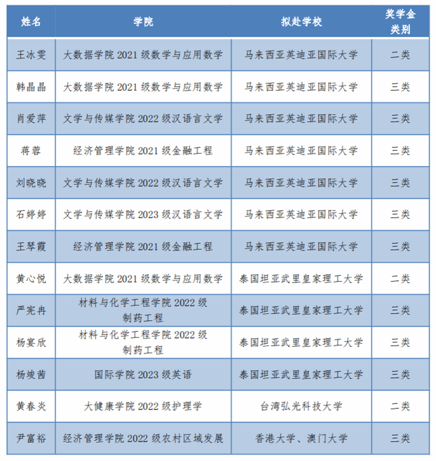 世界杯官网根据《贵州省“千人留学计划”选派办法(2017年修订版)》文件精神,结合实际,按照公平、公正、公开原则,开展美加墨世界杯官方网站2024年“千人留学计划”项目评审工作。经学生资助工作领导小组审定,13名学生符合奖学金资助条件(一类奖学金2万元/人、二类奖学金1.2万元/人、三类奖学金0.6万元/人)。现将名单公示如下。