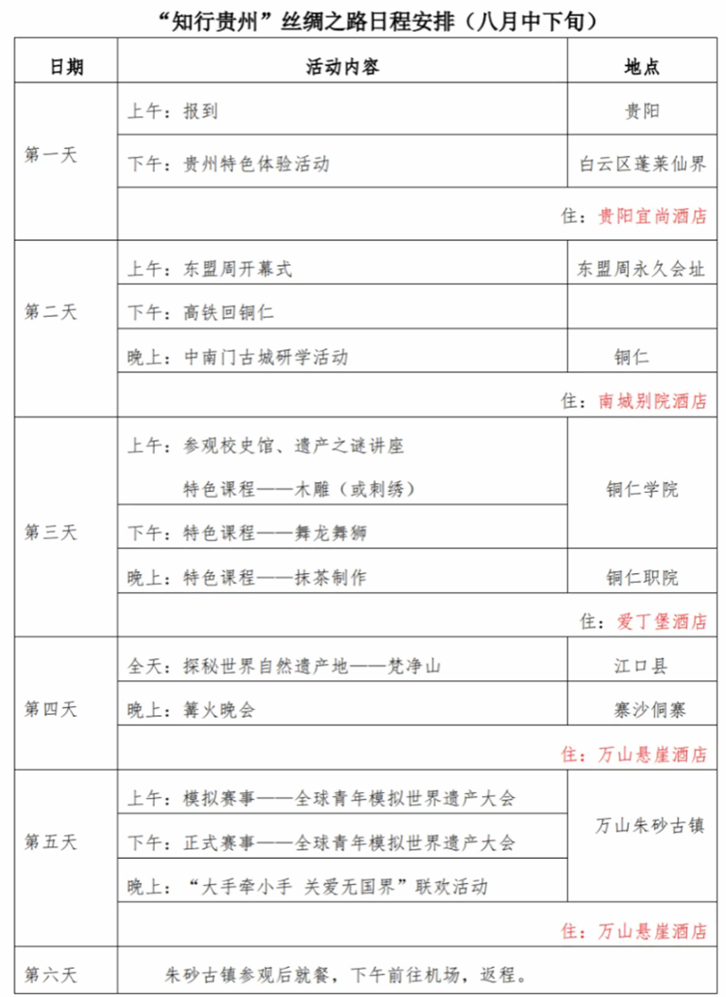 为全面提升美加墨世界杯官方网站学生的国际理解能力和表达能力,提升国际化办学水平,国际合作与交流处8月中旬开展2024“知行贵州”丝绸之路青年交流活动,本次活动得到苏州大学、扬州大学、湖州师范学院的大力支持,特邀请了苏州大学、扬州大学、湖州师范学院国际学生30人和教师4人参加。世界杯官网选拔中国学生20人,国际学生10人,希望各学院积极推动,让更多学生参与,共同推进2024“知行贵州”丝绸之路青年交流活动,请各学院有申报意向的学生于2024年6月2日前将《报名表》发送到1827989690@qq.com。备注:名额有限,满员即止,不收取任何费用,已参加过知行贵州的同学不能再报名。
