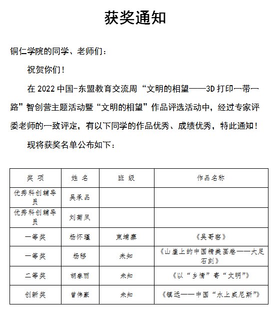 近日,接2022中国-东盟教育交流周“文明的相望——3D打印一带一路”智创营组委会通知,世界杯官网报送的4个参赛作品全部获奖。其中,国际学院柬埔寨籍杨怀瑾同学的《吴哥窟》、教育学院杨移同学的《山崖上的中国精美画卷——大足石刻》获一等奖;教育学院胡春丽的《以“乡情”寄“文明”》获二等奖;人文学院曾伟豪的《镇远——中国“水上威尼斯”》获创新奖。吴承品、刘菊凤两名指导老师获优秀科创辅导员。