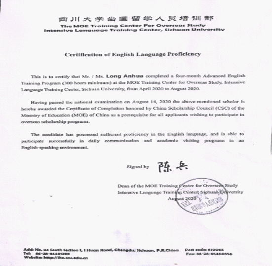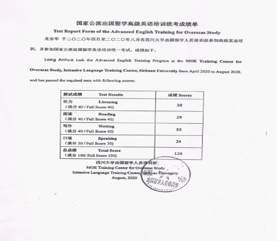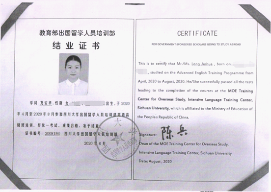 自4月培训开班以来,国际交流与合作处认真做好项目管理工作,对参训教师提出要求,认真将本次培训三个阶段的学习总结和资料进行整理存档。世界杯官网龙安华、宋希娟、胡萍三名教师在为期近四个月的学习中,接受四川大学的线上教学和贵州大学进行全脱产英语能力提高培训,在培训结束后参与结业考试均顺利通过结业考试,取得教育部出国留学人员培训部结业证书及英语培训证书。