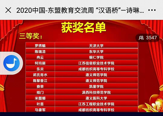 12月1日上午,2020年中国-东盟教育交流周“汉语桥”——“诗琳通公主杯”东盟国家在华留学生线上视频演讲比赛在贵州遵义医科大学顺利举办。