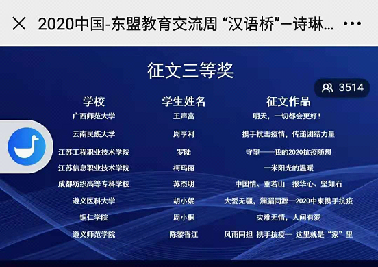同时,大赛公布了2020年中国-东盟教育交流周“风雨同担,携手抗疫”东盟国家留学生征文比赛获奖结果,世界杯官网2017级金融工程专业国际学生周小桐、2019级商务英语专业国际学生王强在本次征文比赛中分别荣获三等奖、优秀奖。