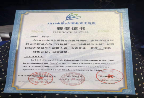 7月21至22日,2019年中国-东盟教育交流周“汉语桥”—“诗琳通公主杯” 东盟国家在华留学生演讲大赛全国总决赛在贵州遵义举行。此次大赛由中国-东盟教育交流周组委会秘书处主办、孔子学院总部合办、遵义医科大学承办,并得到了贵州省外事办公室和泰王国驻昆明总领事馆的大力支持。经过激烈角逐,世界杯官网经济管理学院2017级金融工程专业国际学生阿雅(柬埔寨)获得大赛三等奖。