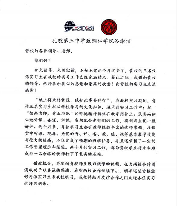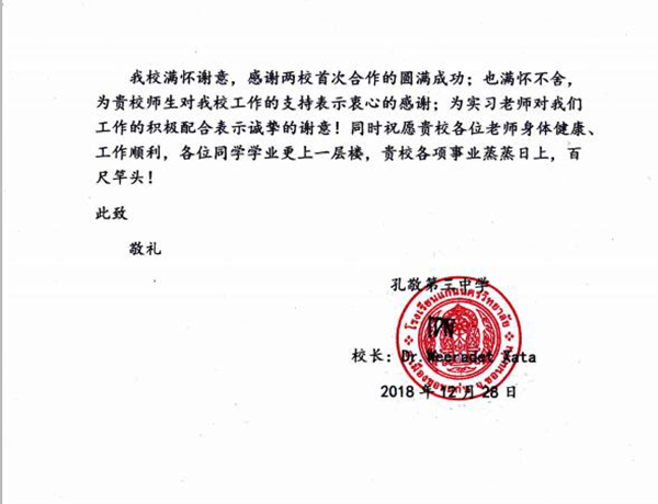 近日,世界杯官网收到海外实习合作学校泰国孔敬第三中学发来的答谢信。信中对世界杯官网派遣学生前往该校进行实习表示感谢,对世界杯官网国际学院2015级的三位实习生,冯琴芬、陈红、李倩倩的实习情况提出肯定与表扬。