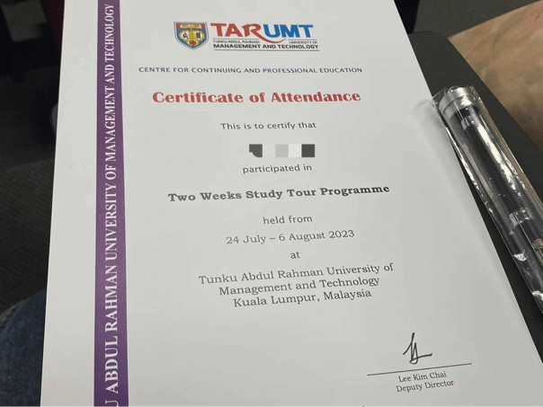 首先想向本次游学活动组织方说声谢谢,因为有这个项目,我才有幸参与到本次活动中,还有奖学金的支持,也非常感谢我们学校给我本次机会,十分感谢。在本次访学活动中,我收获颇丰,观看了极具当地民族风情的演出,品尝了美味的吃食,以及特产“猫山王榴莲”,让原本不吃榴莲的我,懂得了它的美味。在拉曼理工大学学习期间,我体验到了不同的教育方式,学习到了很多不一样的知识,比如TRIZ创新理论中的40个发明原则,马来语的发音拼读,公共演讲课程等等,让我收益良多。最值得开心的还是认识到了当地的同学们,他们的淳朴热情深深的感染着我,我们还做了约定,当他们来中国时,会来贵州做客,我一定也会像他们一样热情的招待他们。优美的风景,质朴的人们,积极向上的生活态度,这是马来西亚留给我的印象,这次很好,下次再见!