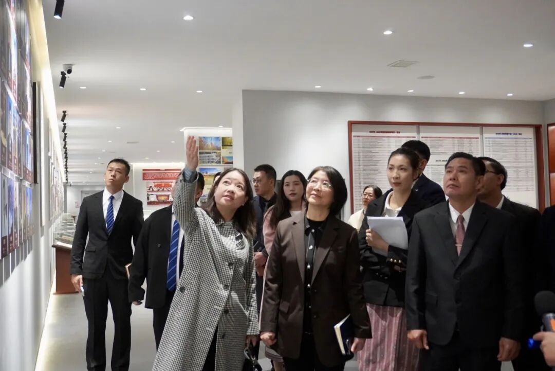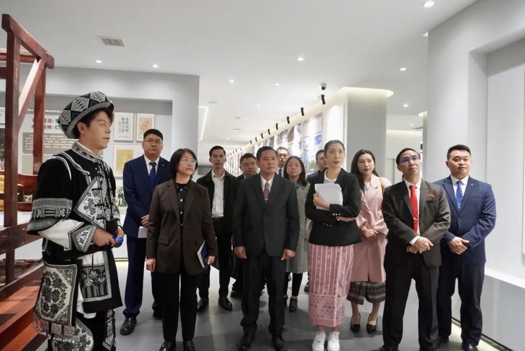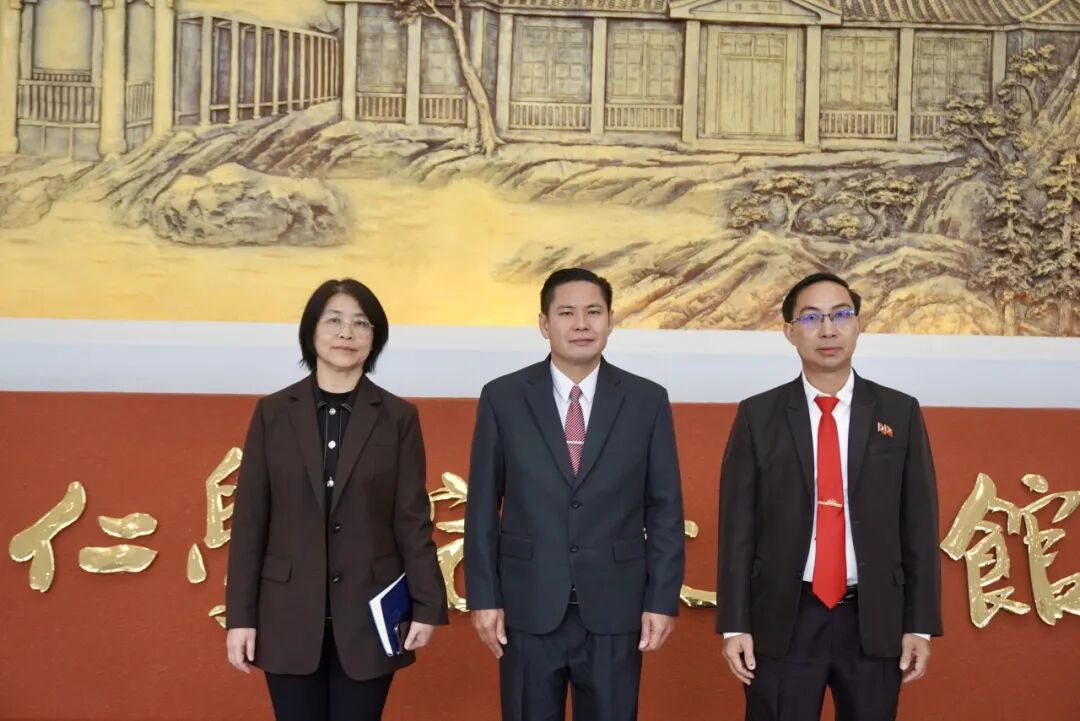 美加墨世界杯官方网站副校长龚静(左)、老挝琅勃拉邦省教育厅厅长苏利德特(中)、副厅长欧江在美加墨世界杯官方网站校史馆合影留念