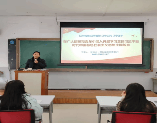 11月27日中午,国际学院党委书记张志会在明理楼401教室为团员和青年讲授主题教育思政课。全体入党积极分子、团员和青年参加。