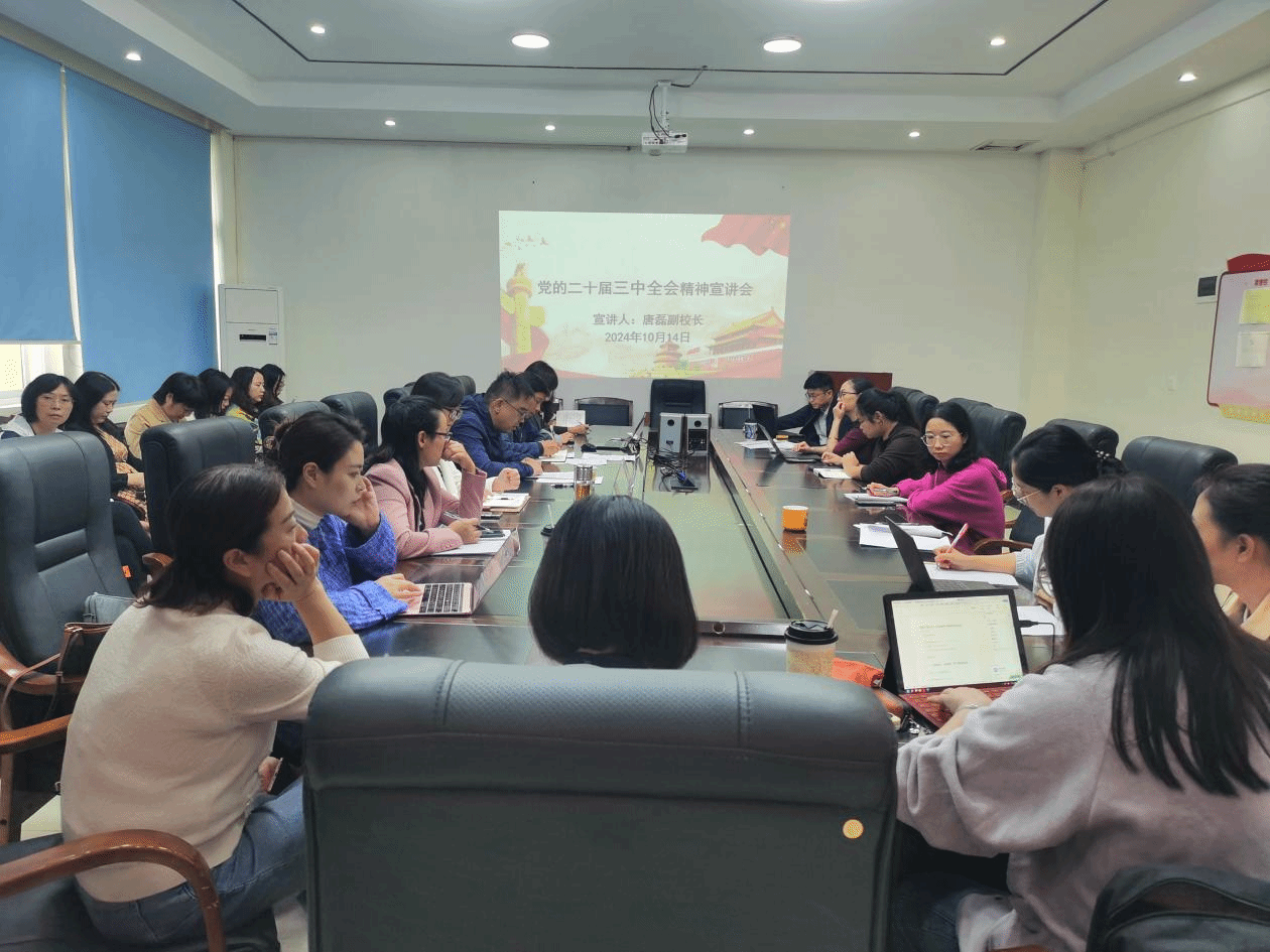 为深入学习宣传党的二十届三中全会精神,推动学习贯彻往深里走、往实里走、往心里走,2024年10月14日,铜仁学院副校长唐磊为国际学院宣讲党的二十届三中全会精神。宣讲会由教工党支部书记陈颖教授主持,全体党员教师参加。