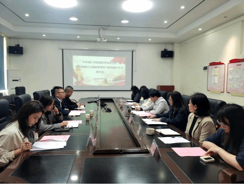 研讨交流环节,与会人员紧扣会议主题、结合工作实际,依次作交流发言,谈认识、找差距、定举措,做到学思用贯通、知信行统一。徐美以“深学细悟强担当 补弱提质促发展”为题发言,从坚守初心、为师生服务、科学决策、真抓实干四个方面分享学习体会,直面理论学习不系统、政绩观认识不深刻、工作督导不到位等七个方面的突出问题,明确提出强化理论武装、聚焦立德树人、坚持科学决策、站稳师生立场的具体改进路径。院长李谦以“树立和践行正确政绩观推动国际学院高质量发展主动服务学校“双优建设”为题发言,阐明开展学习教育的重要意义,强调要深刻把握正确政绩观的丰富内涵,推动国际化办学从“量”的扩张向“质”的提升转变,持续深化专业转型发展,切实把正确政绩观融入办学治院全过程。副书记鲁芮汐结合分管工作,从领会核心要义、践行实践要求、锤炼能力本领三个方面,具体阐述如何以正确政绩观赋能育人工作提质增效,推动各项育人举措落地见效。