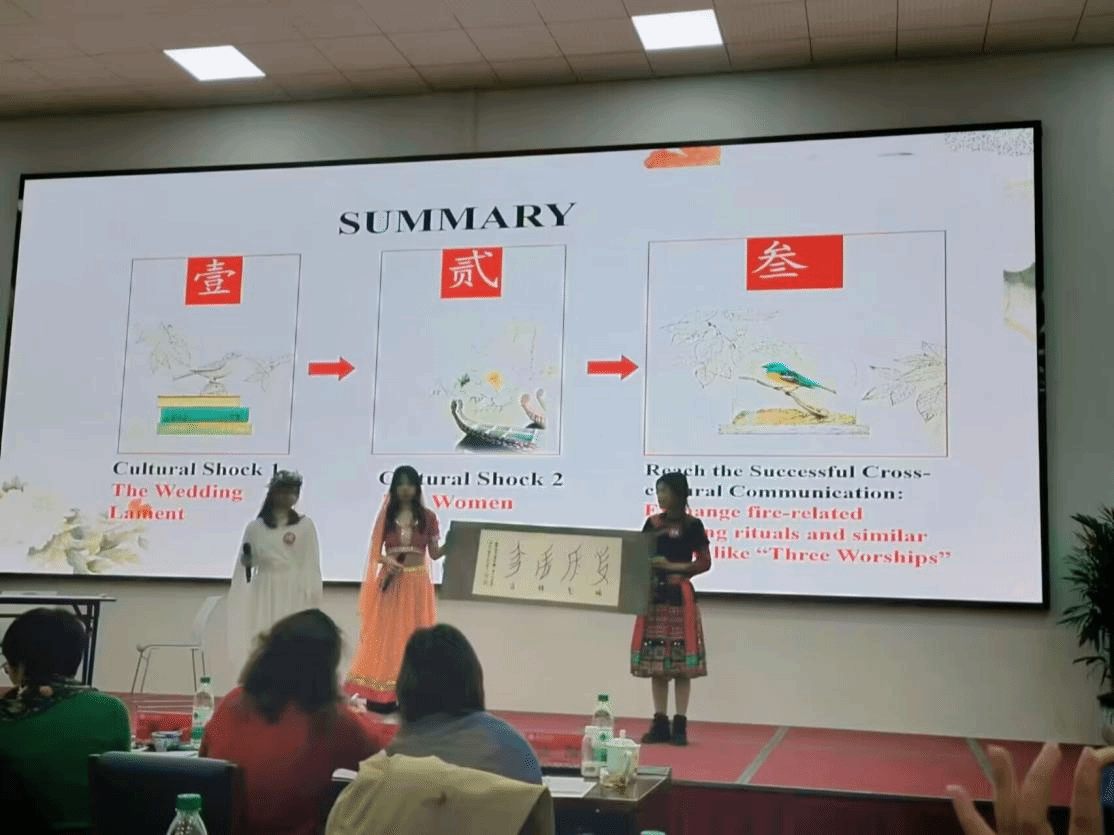 美加墨世界杯官方网站代表队由胡红渊老师带队,国际学院22级商务英语专业刁银利、文化与传播学院23级汉语言文学专业余添添和24级汉语言文学专业刘紫婧同学代表美加墨世界杯官方网站参加本次比赛。她们的参赛作品“Interesting wedding Custom”凭借有趣的内容、深刻的剖析、和流利的现场展现表现出了优秀的跨文化交际能力,赢得了评委和观众的好评。经过激烈的角逐,世界杯官网代表队最终荣获二等奖,为学校赢得了荣誉。