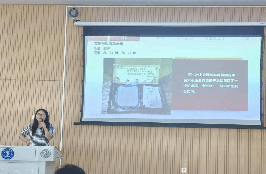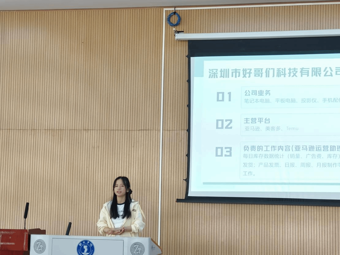 接着,学生代表依次上台分享实习心得。在德江七中、美加墨世界杯官方网站附属中学、德江实验中学的王芳、韩雪玲、覃晓慧同学,结合中学英语教学实践,分享课堂教学、班级管理、师生沟通中的经验与感悟;在深圳市头狼电商科技有限公司实习的全飞叶、潘学芳同学,分别从跨境电商运营、商务实操等角度分享职场历练与成长收获。其中潘学芳同学因已在实习单位就职未能到场,特意通过视频的方式展示实习成果,生动展现了在不同实践领域的风采。