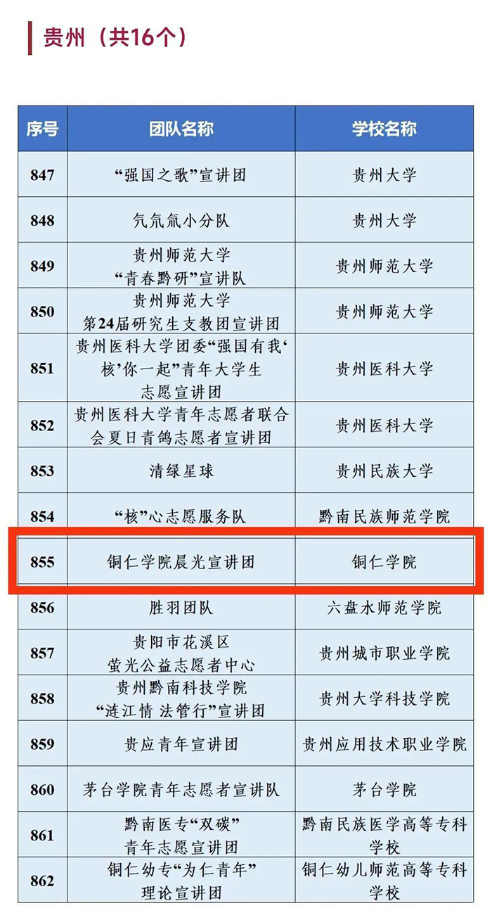 近日,2022年“强国有我‘核’你一起”千支大学生志愿宣讲团入选名单公布。贵州省共16个团队入选,其中包含美加墨世界杯官方网站晨光宣讲团。
