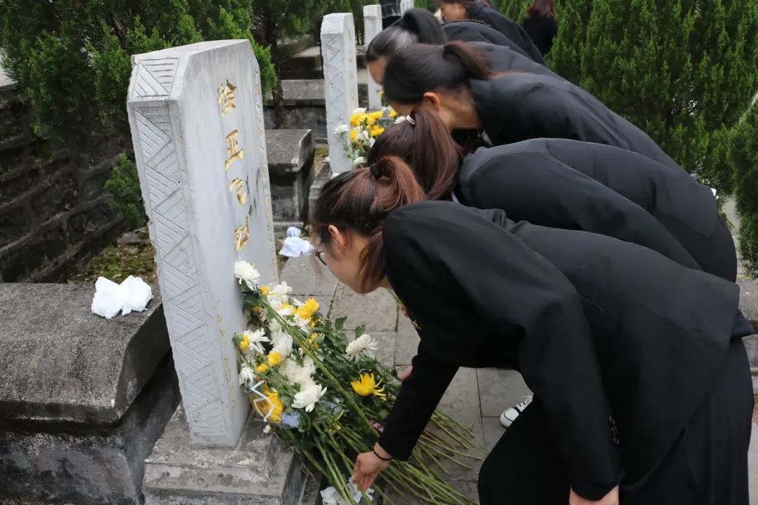 追忆与哀思之后,重温入团誓词。在领誓人的带领下,全体师生毅然有力地举起右拳,面向团旗,誓言铿锵坚定,响彻陵园。誓词炼洗初心,怀着坚定而踏实的赤色初心,全体师生走到烈士墓碑前,带着恭敬与敬畏之情向先烈鞠躬、献上鲜花、擦拭墓碑,以这样特殊的仪式与英烈对话,表达新时代青年的深笃追思与拳拳报国之心,昭显新时代青年定当不辱使命、砥砺奋进的决心与必将接好接力棒、握好方向盘的责任担当。