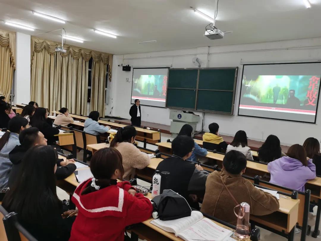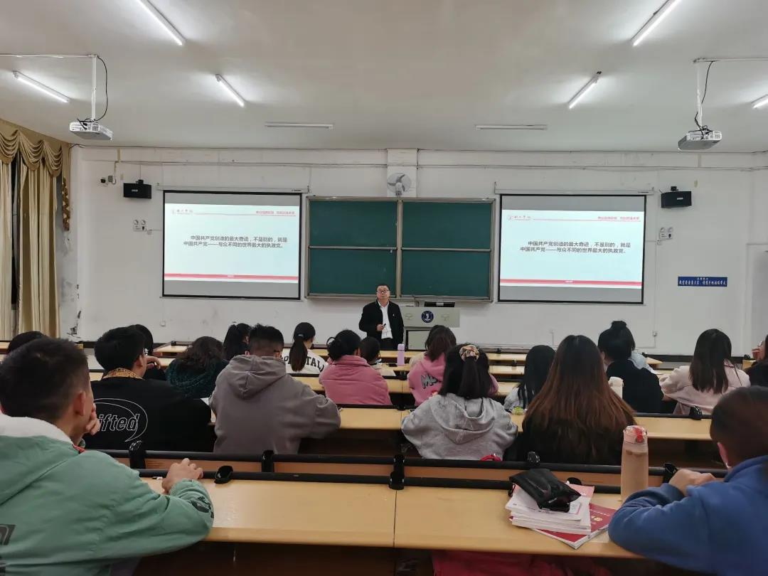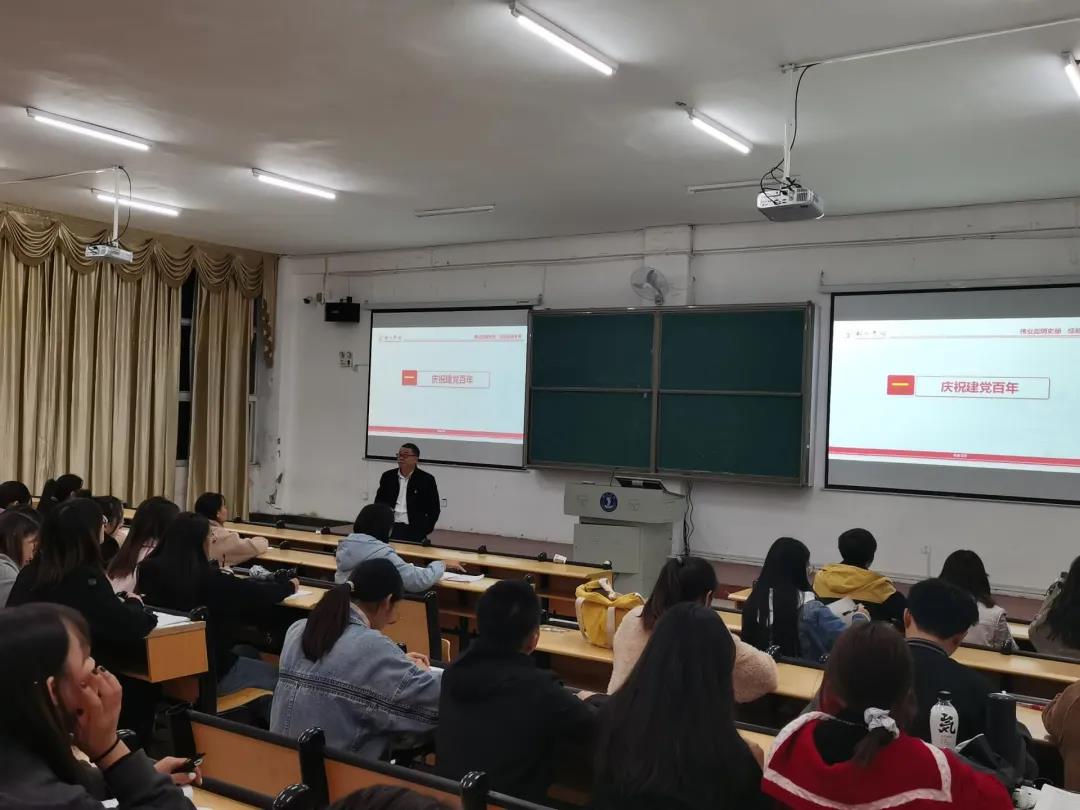 “为有牺牲多壮志,敢教日月换新天”,皮坤乾教授引导同学们通过观看视频重回浴血奋战的悲壮战场——困牛山壮举,视频中百余名红军战士纵身跳崖,生动展现了红军烈士“何须马革裹尸还”的英雄气概,昭示了革命英雄绝对忠诚赤诚为民的政治品格。新时代青年要认真学习革命先辈绝对忠诚、信念坚定、勇于牺牲、赤诚为民的崇高精神,这是中国共产党人初心使命的生动诠释。而作为新时代青年大学生,勇担使命是我们纪念革命先辈最好的方式。随后,皮坤乾教授从救国、兴国、富国、强国四个方面对“四个伟大成就”进行了深入解读,对伟大建党精神进行了详细阐述,对“九个必须”进行回顾和展望,深刻地诠释了中国共产党的伟大建党精神。