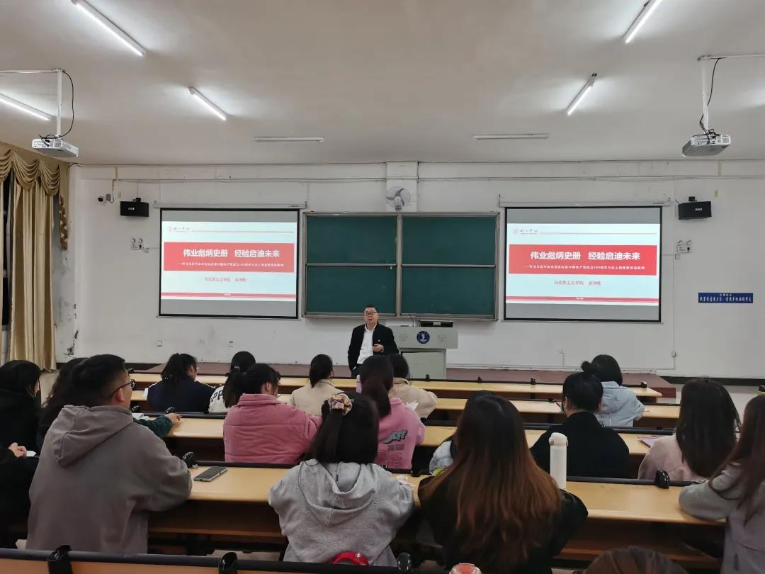 皮坤乾教授以《伟业彪炳史册,经验启迪未来——学习贯彻习近平总书记在庆祝中国共产党成立100周年大会上的重要讲话精神》为题,重温了习近平总书记“七一”重要讲话精神,深刻回顾了国家和民族遭受的百年屈辱和深重灾难,并从“全面建成小康社会,实现第一个百年奋斗目标”“中国共产党100年来的奋斗历程和创造的伟大成就”“以史为鉴、开创未来的根本要求”三个方面对中国共产党历史上的重大成就、伟大精神、根本要求进行生动解读,深入分析了中国共产党百年奋斗的光辉历程、伟大成就、宝贵经验和实践启示,同时对建党精神的深刻内涵和时代价值进行讲解。