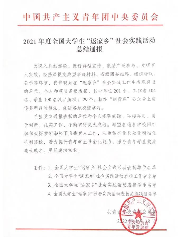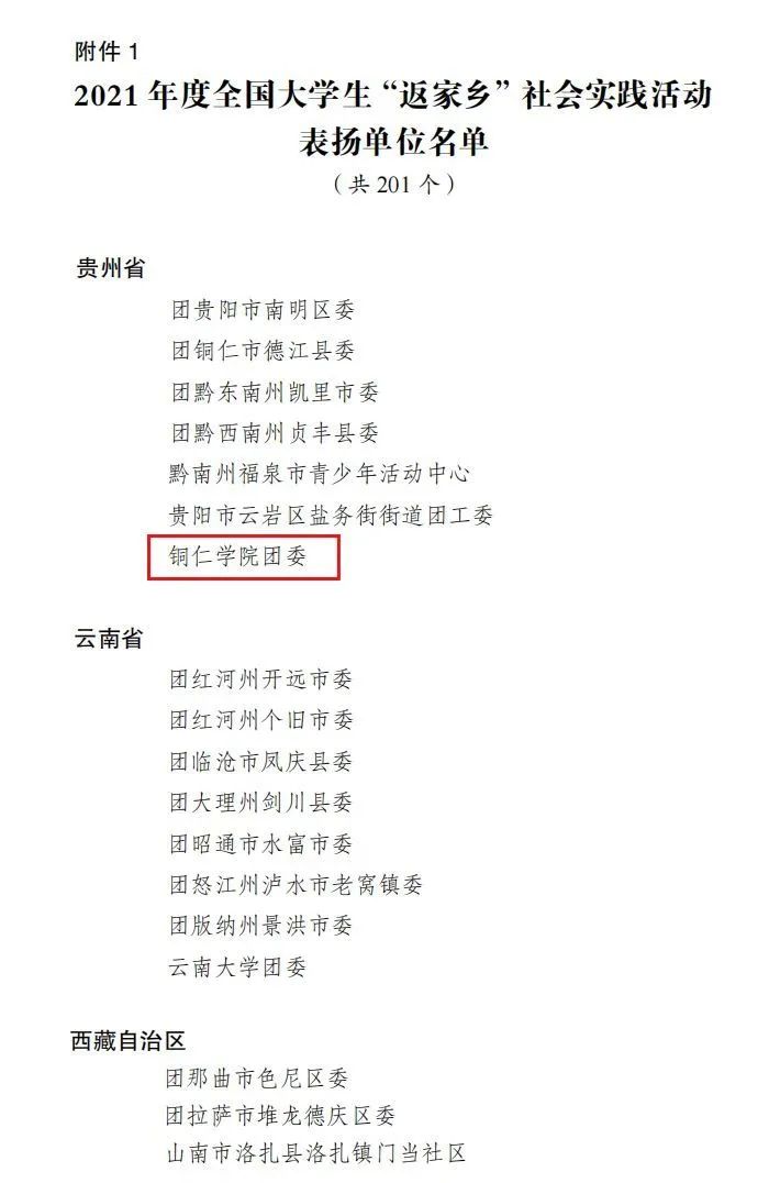 近日,共青团中央发布了2021年度大学生“返家乡”社会实践活动总结通报,对表现突出集体、个人和项目进行表扬。美加墨世界杯官方网站团委获评2021年度全国大学生“返家乡”社会实践活动表扬单位,也是贵州省唯一荣获此表彰的高校团委。